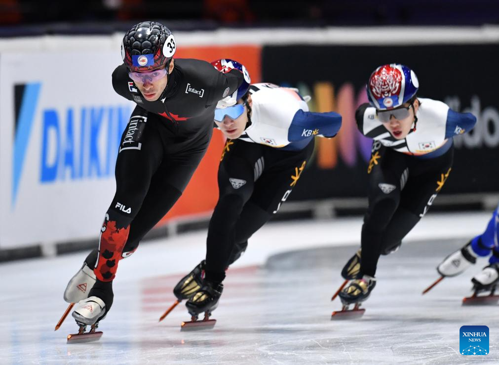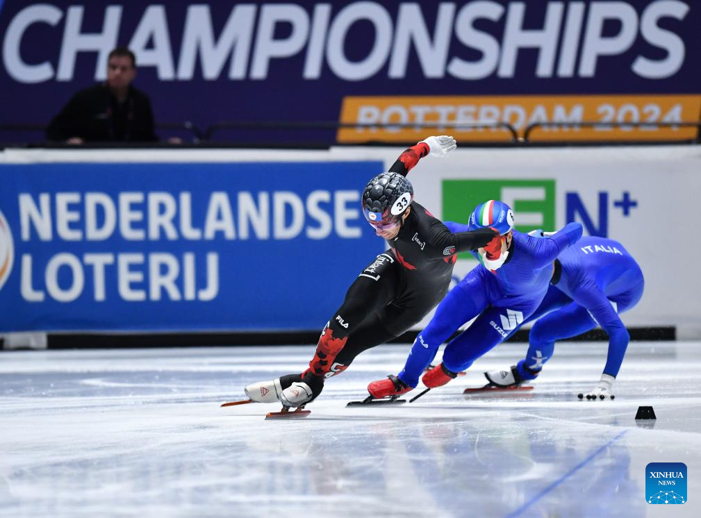 William Dandjinou (1st L) of Canada competes during the men's 1000m final A at the ISU World Short Track Speed Skating Championships 2024 in Rotterdam, the Netherlands, March 17, 2024. (Xinhua/Lian Yi)