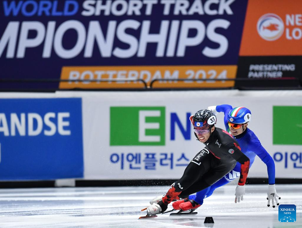 William Dandjinou (L) of Canada competes during the men's 1000m final A at the ISU World Short Track Speed Skating Championships 2024 in Rotterdam, the Netherlands, March 17, 2024. (Xinhua/Lian Yi)