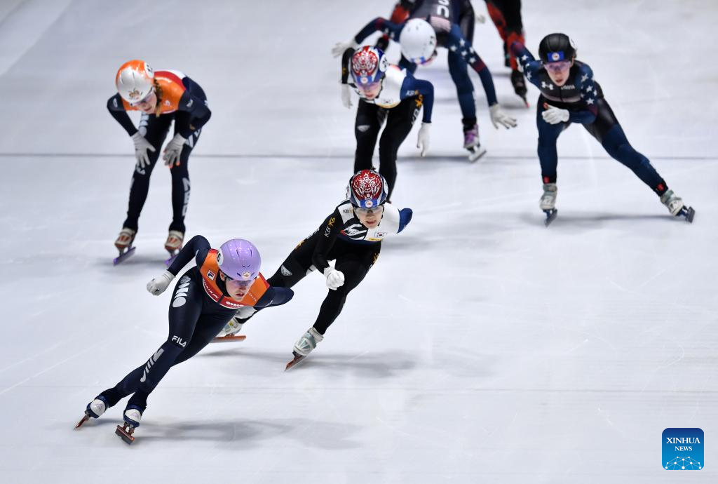 Michelle Velzeboer (front) of the Netherlands competes during the women's 3000m relay at the ISU World Short Track Speed Skating Championships 2024 in Rotterdam, the Netherlands, March 17, 2024. (Xinhua/Lian Yi)