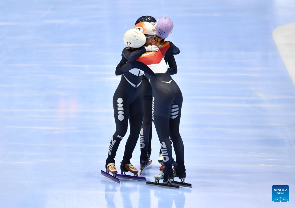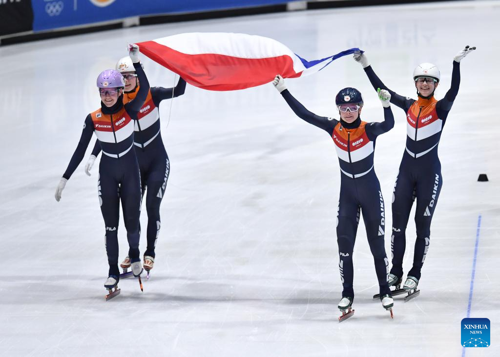Team the Netherlands celebrate after the women's 3000m relay at the ISU World Short Track Speed Skating Championships 2024 in Rotterdam, the Netherlands, March 17, 2024. (Xinhua/Lian Yi)