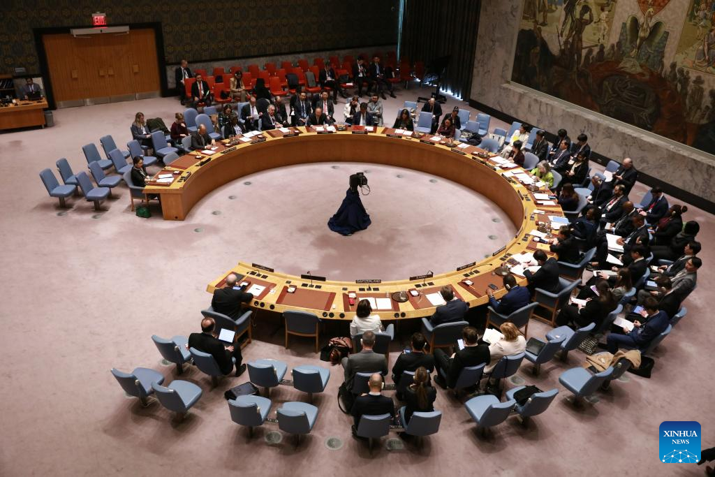 The United Nations Security Council holds a meeting on nuclear disarmament and non-proliferation at the UN headquarters in New York, on March 18, 2024. UN Secretary-General Antonio Guterres on Monday called on nuclear weapon states to lead the way toward nuclear disarmament, including an agreement on no first use. (Xinhua/Xie E)