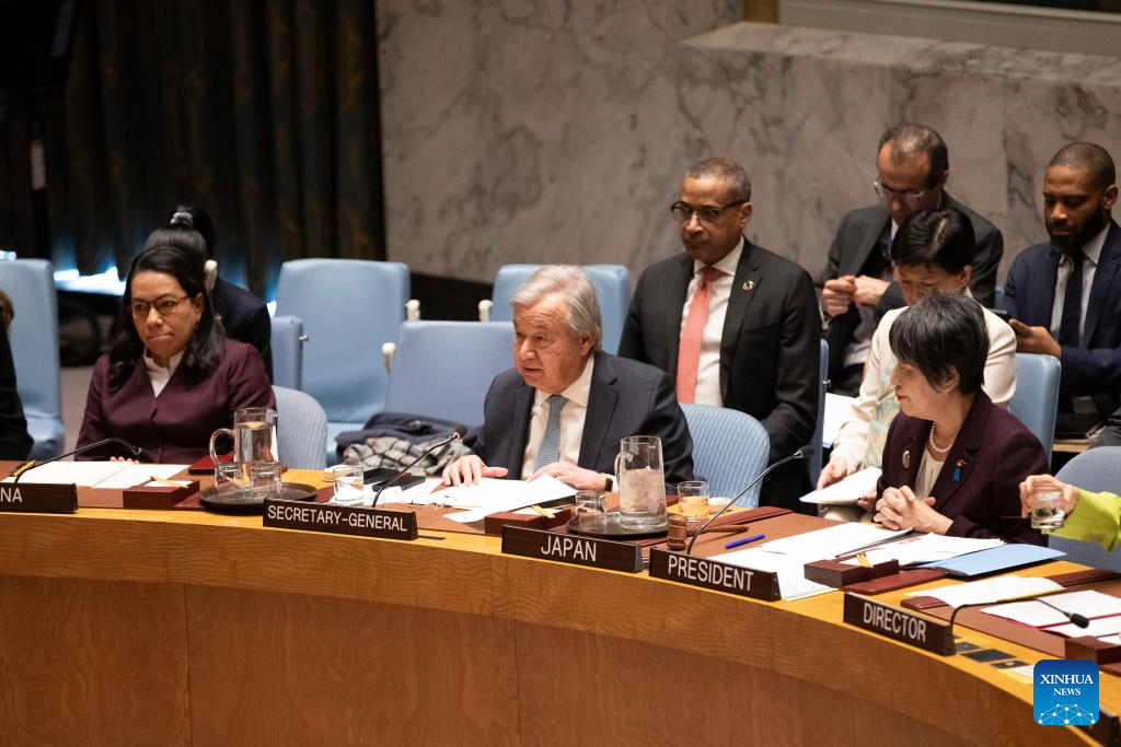 UN Secretary-General Antonio Guterres (C, Front) speaks at a Security Council meeting on nuclear disarmament and non-proliferation at the UN headquarters in New York, on March 18, 2024. Guterres on Monday called on nuclear weapon states to lead the way toward nuclear disarmament, including an agreement on no first use. (Xinhua/Xie E)