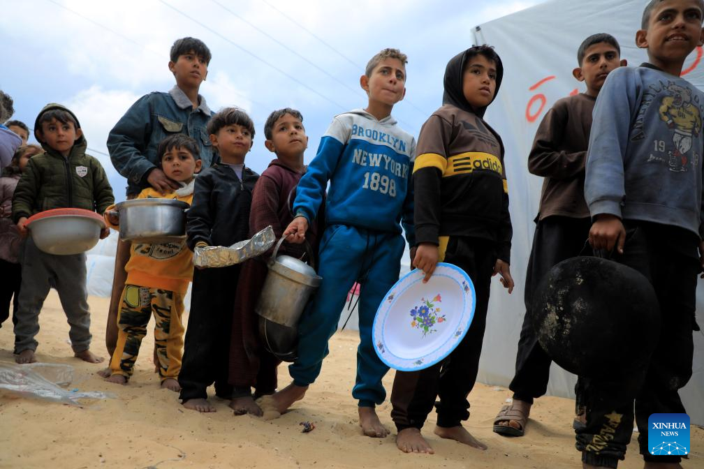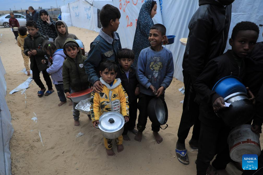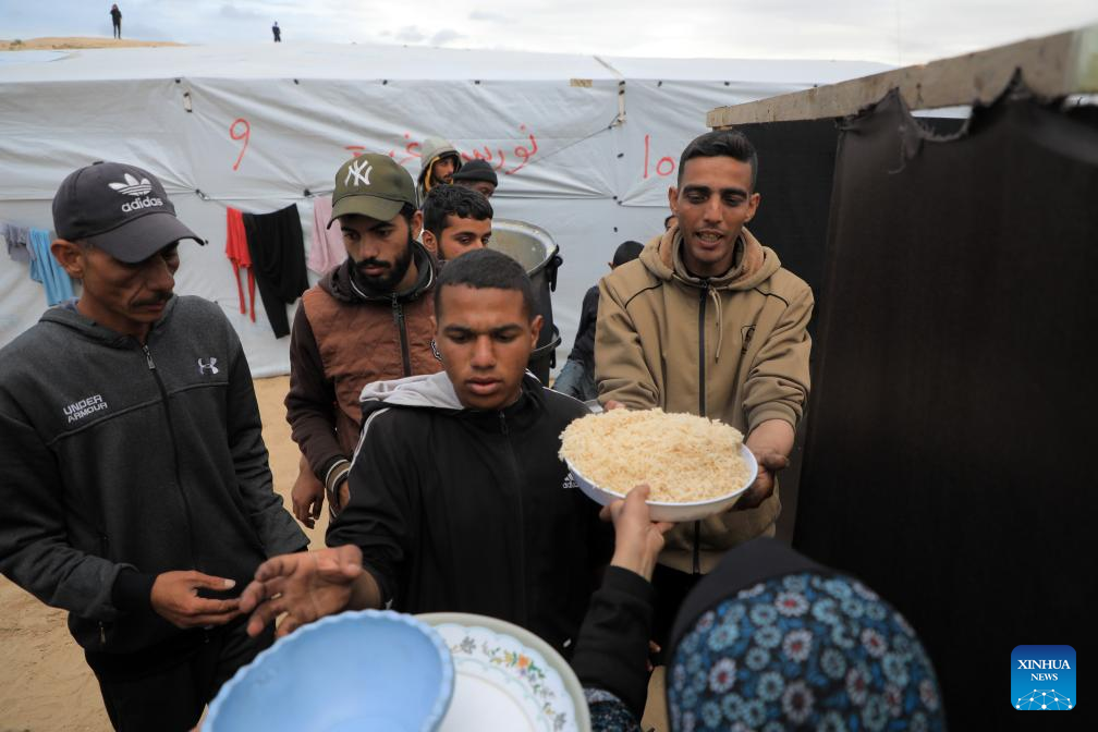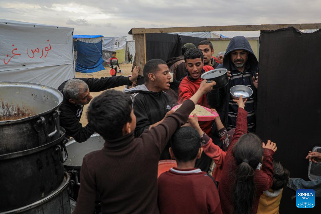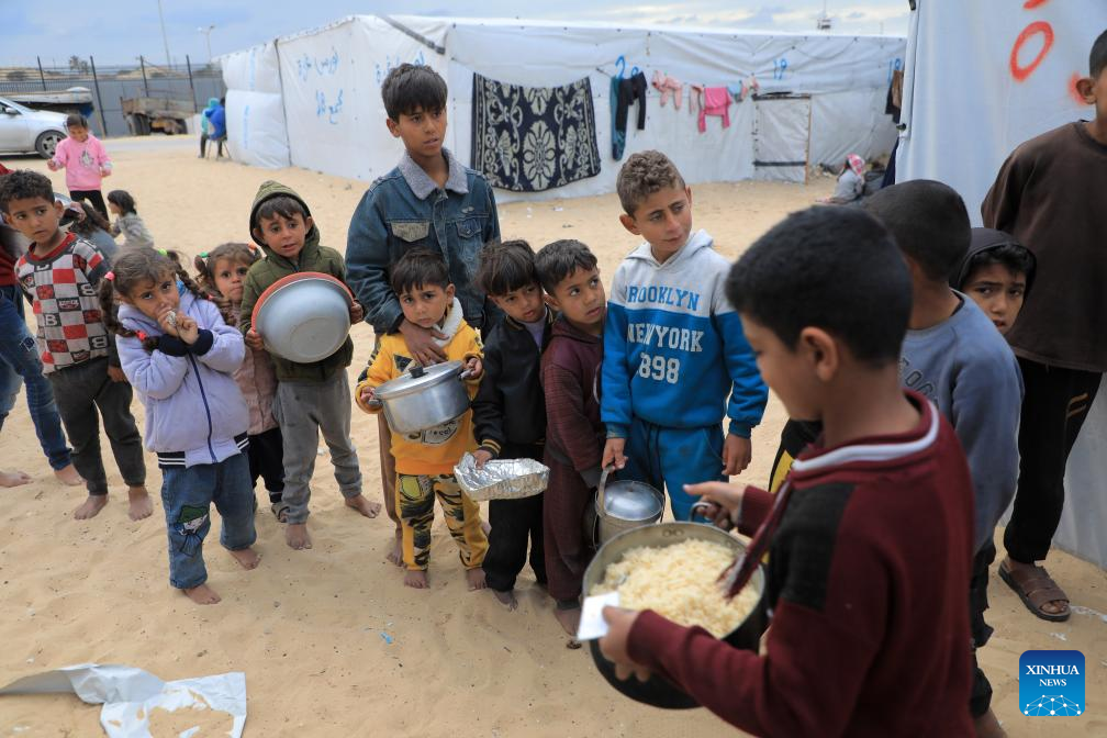People get free food in the southern Gaza Strip city of Rafah, on March 18, 2024. UN Secretary-General Antonio Guterres on Monday called on the Israeli authorities to ensure complete and unfettered access for humanitarian goods throughout Gaza. (Photo by Rizek Abdeljawad/Xinhua)