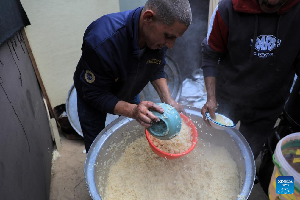A volunteer distributes free food in the southern Gaza Strip city of Rafah, on March 18, 2024. UN Secretary-General Antonio Guterres on Monday called on the Israeli authorities to ensure complete and unfettered access for humanitarian goods throughout Gaza. (Photo by Rizek Abdeljawad/Xinhua)