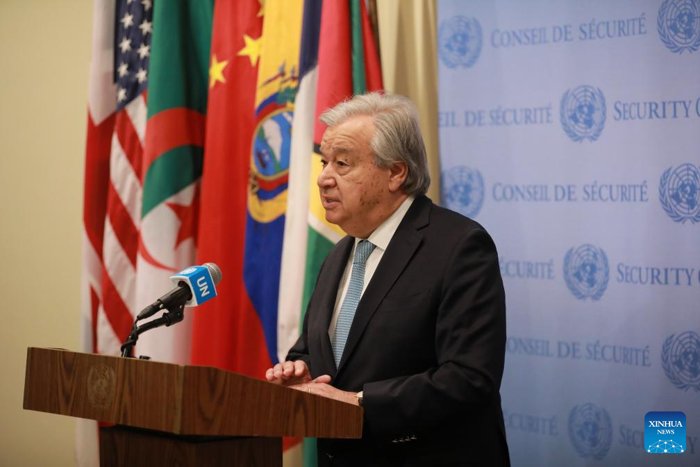 UN Secretary-General Antonio Guterres speaks to the press outside the Security Council Chamber at the UN headquarters in New York on March 18, 2024. Guterres on Monday called on the Israeli authorities to ensure complete and unfettered access for humanitarian goods throughout Gaza. (Xinhua/Xie E)