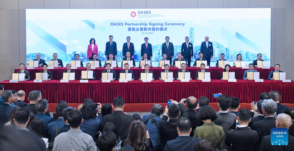 This photo taken on March 20, 2024 shows a signing ceremony held by the Office for Attracting Strategic Enterprises (OASES) of the Hong Kong Special Administrative Region (HKSAR) government in south China's Hong Kong.