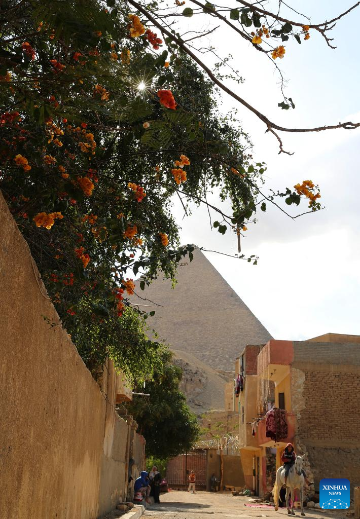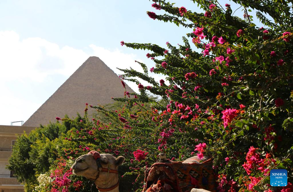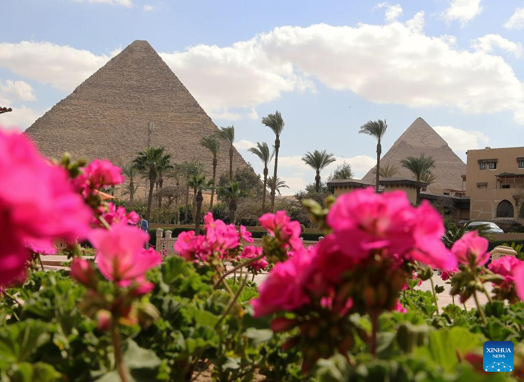 This photo taken on March 19, 2024 shows blooming flowers near the Khufu Pyramid in Giza, Egypt. (Xinhua/Wang Dongzhen)