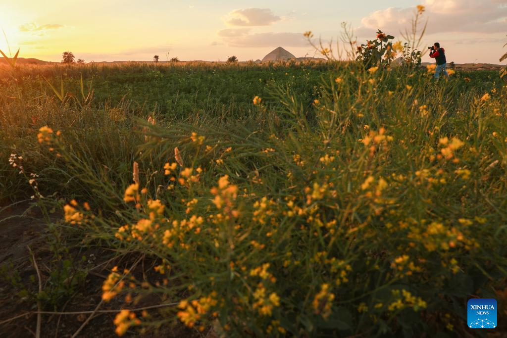 This photo taken on March 19, 2024 shows the spring scenery near the Bent Pyramid in Giza, Egypt. (Xinhua/Sui Xiankai)