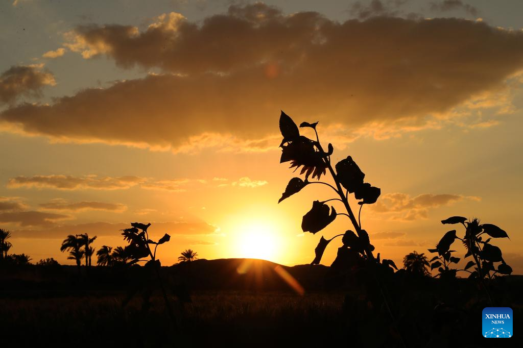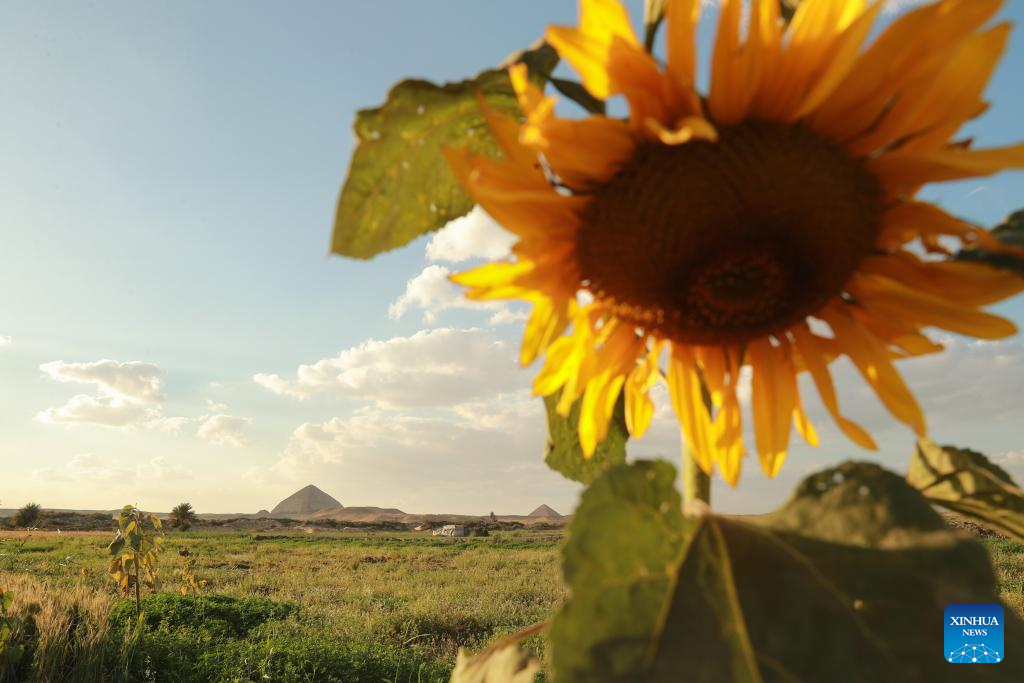 This photo taken on March 19, 2024 shows sunflowers near the Bent Pyramid in Giza, Egypt. (Xinhua/Wang Dongzhen)