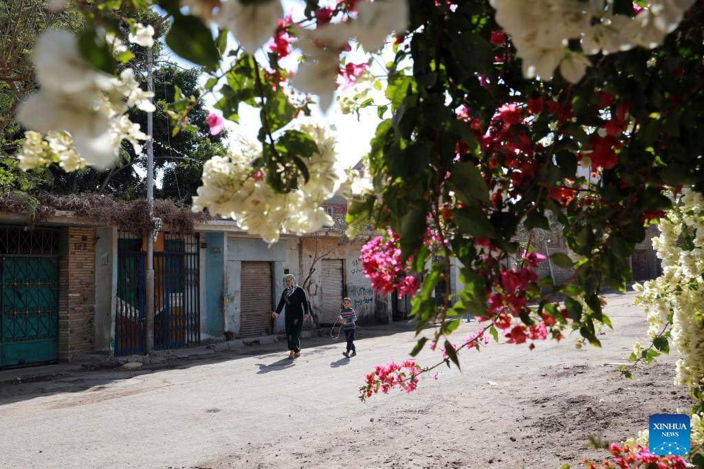 People walk past blooming flowers in Giza, Egypt, March 19, 2024. (Xinhua/Sui Xiankai)