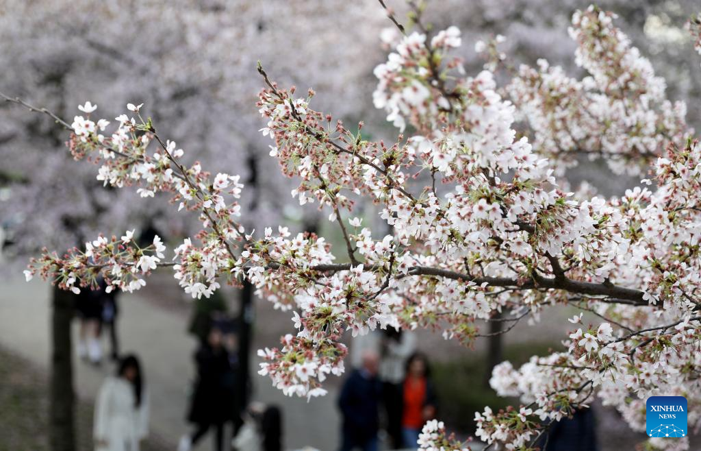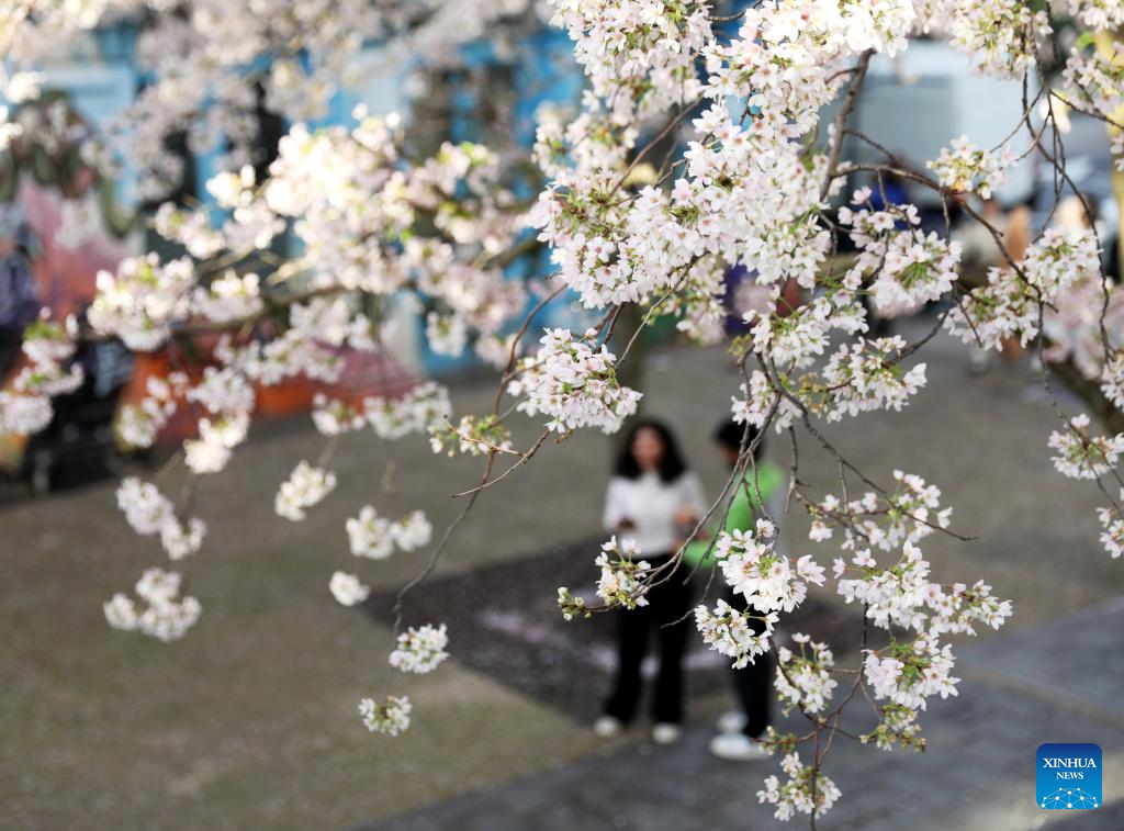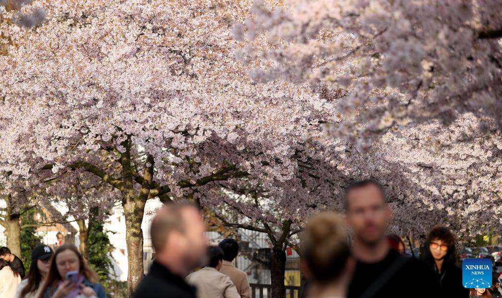 People walk under blooming cherry trees in London, Britain, March 20, 2024. (Xinhua/Li Ying)