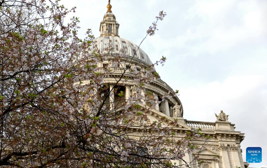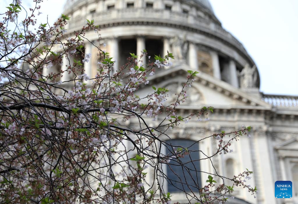 Cherry blossoms are pictured near St. Paul's Cathedral in London, Britain, March 20, 2024. (Xinhua/Li Ying)