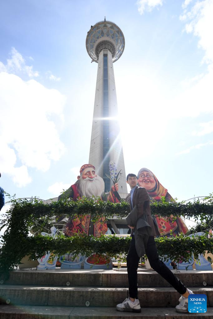 A man walks past the Milad Tower with decorations celebrating the Nowruz, the Iranian New Year, in Tehran, Iran, March 20, 2024. (Xinhua/Shadati)