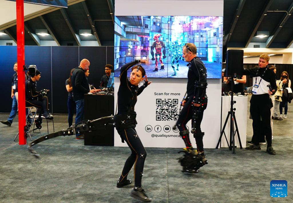 An exhibitor demonstrates with a motion capture device during the 2024 Game Developers Conference in San Francisco, California, the United States, March 20, 2024. The conference runs from March 18 till March 22. (Photo by Andrea Chen/Xinhua)