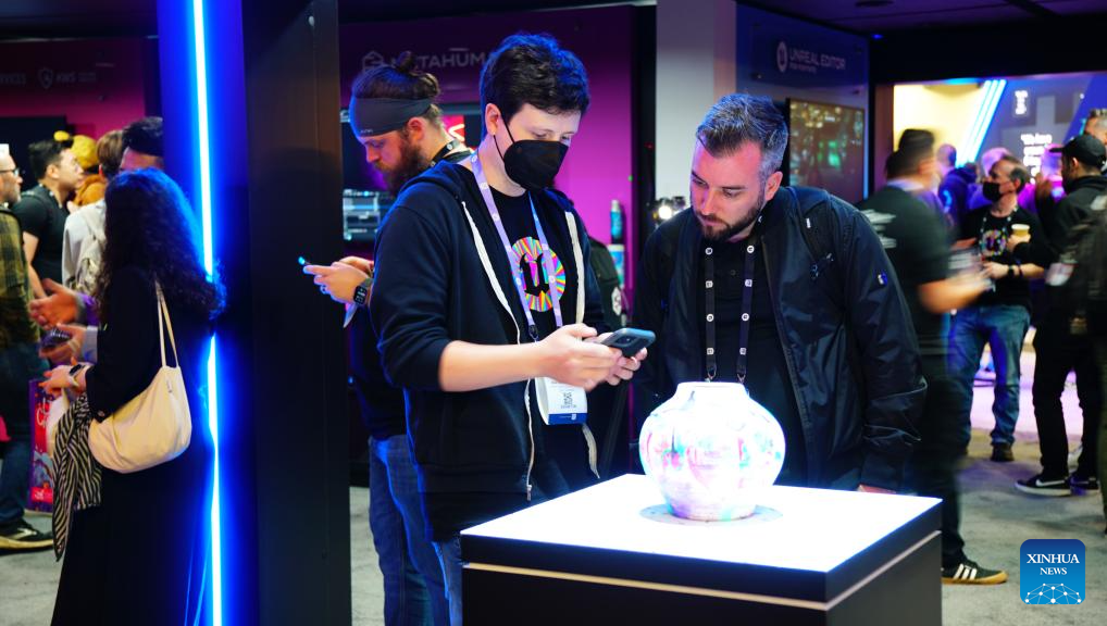 A visitor takes photos of an item on display during the 2024 Game Developers Conference in San Francisco, California, the United States, March 20, 2024. The conference runs from March 18 till March 22. (Photo by Andrea Chen/Xinhua)