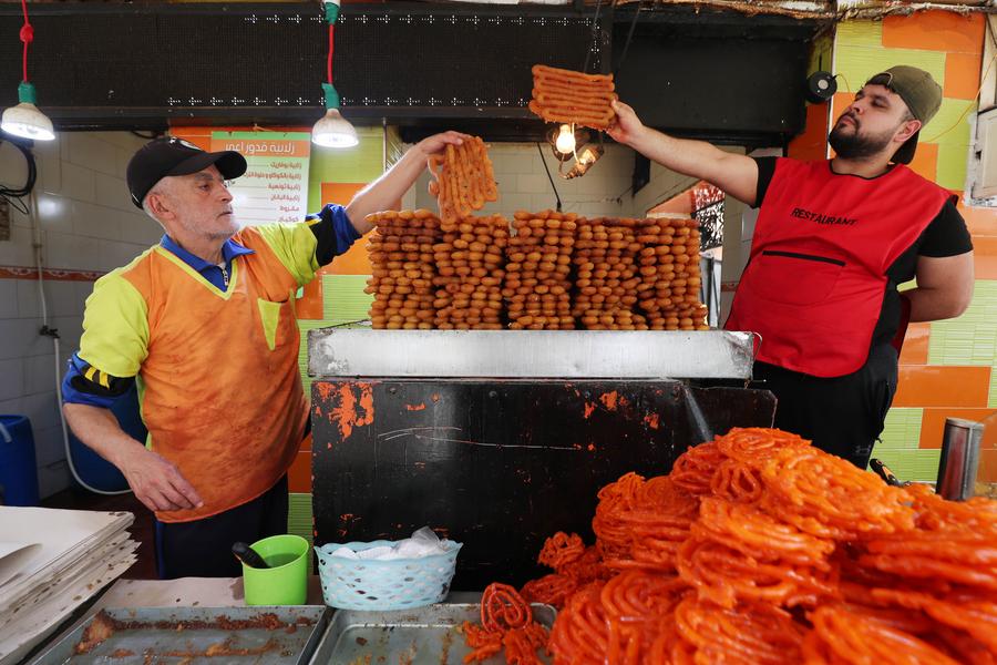 A man shows a piece of traditional sweets at a store during Ramadan in Baghdad, Iraq, on March 18, 2024. (Xinhua/Khalil Dawood)Sweets are seen during the Ramadan in Tripoli, Lebanon, March 19, 2024. (Photo by Khaled Habashiti/Xinhua)A vendor prepares sweets during the Ramadan in Tripoli, Lebanon, March 19, 2024. (Photo by Khaled Habashiti/Xinhua)People prepare traditional dessert known as Zalabia during Ramadan in Boufarik, Algeria, on March 20, 2024. (Xinhua)A man prepares sweets at a market during Ramadan in Amman, Jordan, on March 20, 2024. (Photo by Mohammad Abu Ghosh/Xinhua)■