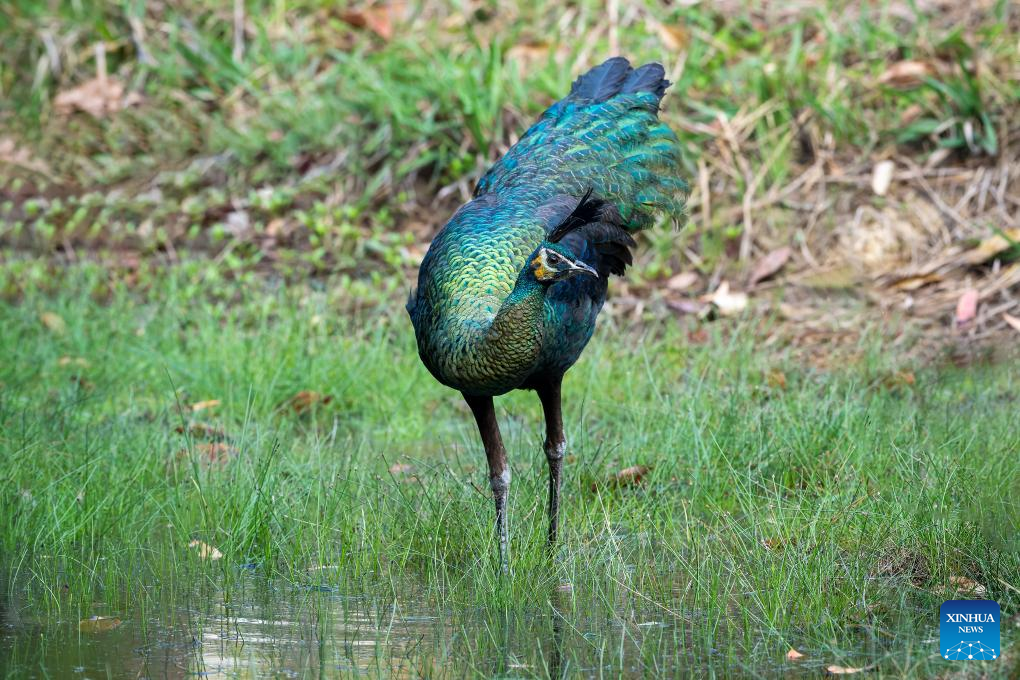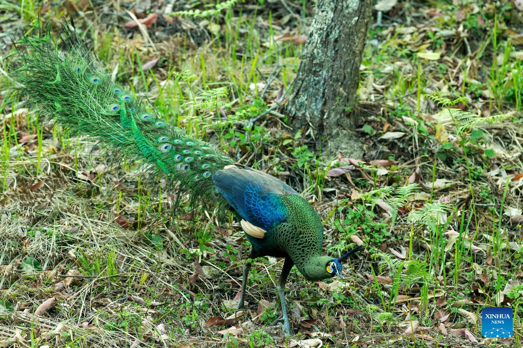 This photo taken on March 16, 2024 shows a peacock in the Zhenkang Nanpenghe provincial nature reserve in Zhenkang County, southwest China's Yunnan Province. (Xinhua)