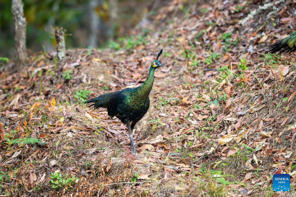 KUNMING, March 22 (Xinhua) -- A total of five rare green peacocks were captured on March 16 by infrared cameras in the Zhenkang Nanpenghe provincial nature reserve in Zhenkang County, southwest China's Yunnan Province, according to the management and protection bureau of the reserve.