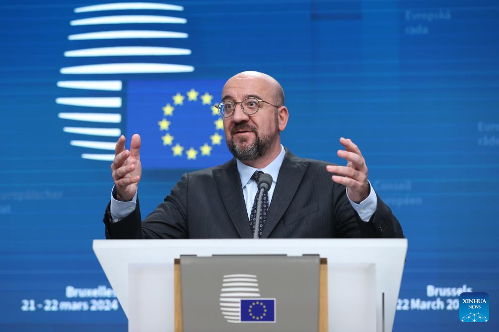 European Council President Charles Michel speaks at a press conference during the European Union (EU) summit in Brussels, Belgium, on March 21, 2024. Leaders from the EU on Thursday agreed to open accession negotiations with Bosnia and Herzegovina. (Xinhua/Zhao Dingzhe)