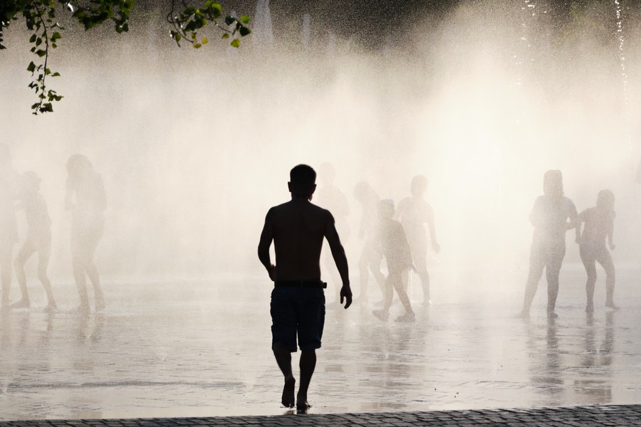 A man walks into a fountain to cool off in Madrid, Spain, July 17, 2023. (Xinhua/Meng Dingbo)
