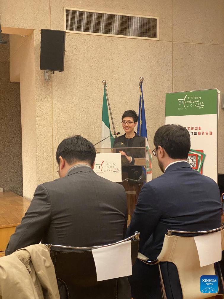 This photo taken with a mobile phone shows Wen Zheng, a professor of Beijing Foreign Studies University, speaking during an event commemorating the 700th anniversary of Marco Polo's death at the Italian Embassy in China in Beijing, capital of China, March 20, 2024. (Xinhua/Luo Xin)