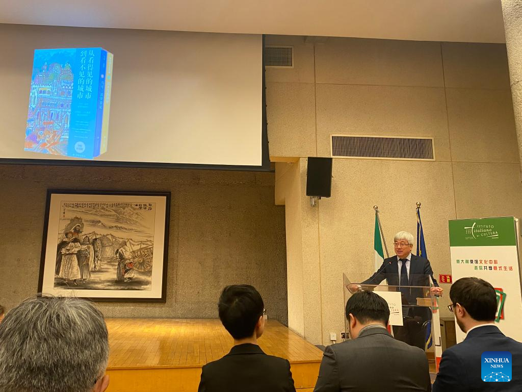 This photo taken with a mobile phone shows Lu Zhizhou, deputy chief editor of Yilin Press, speaking during an event commemorating the 700th anniversary of Marco Polo's death at the Italian Embassy in China in Beijing, capital of China, March 20, 2024. (Xinhua/Luo Xin)