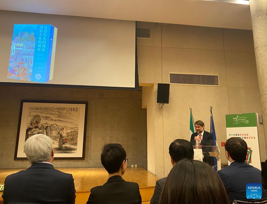 This photo taken with a mobile phone shows Italian Ambassador to China Massimo Ambrosetti speaking during an event commemorating the 700th anniversary of Marco Polo's death at the Italian Embassy in China in Beijing, capital of China, March 20, 2024. (Xinhua/Luo Xin)