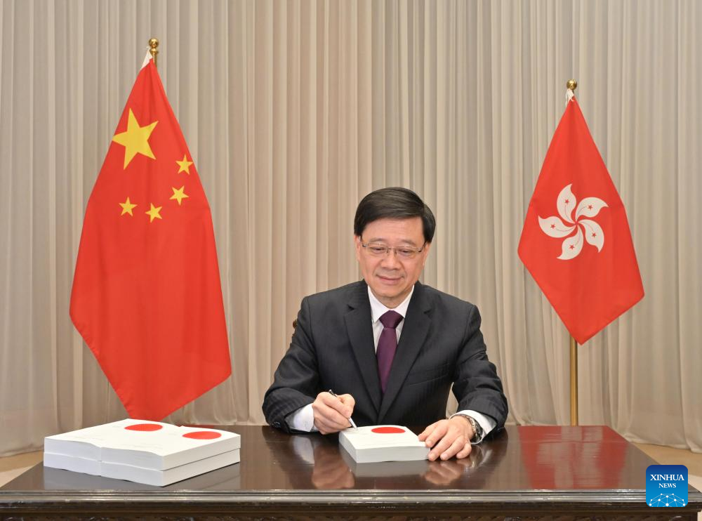 HONG KONG, March 22 (Xinhua) -- John Lee, chief executive of the Hong Kong Special Administrative Region (HKSAR), on Friday signed the Safeguarding National Security Ordinance passed by the HKSAR Legislative Council earlier this week.