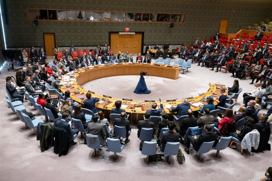 Representatives vote on a draft resolution during a UN Security Council meeting at the UN headquarters in New York, on March 22, 2024. (Eskinder Debebe/UN Photo/Handout via Xinhua)