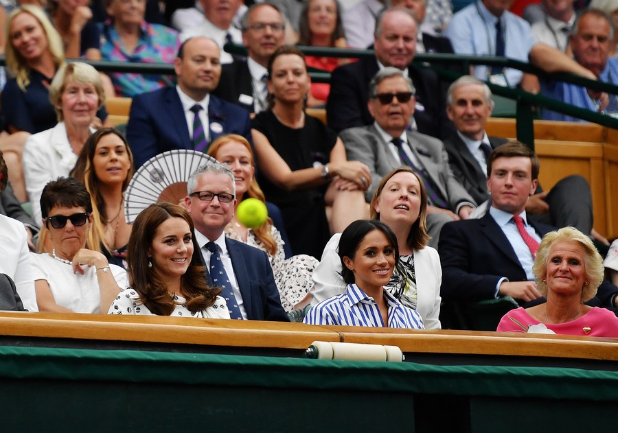 Britain's Princess Kate (1st L, front) is seen during the men's singles semi-final match between Novak Djokovic of Serbia and Rafael Nadal of Spain at the Wimbledon Championships 2018 in London, Britain, on July 14, 2018. (Xinhua/Guo Qiuda)