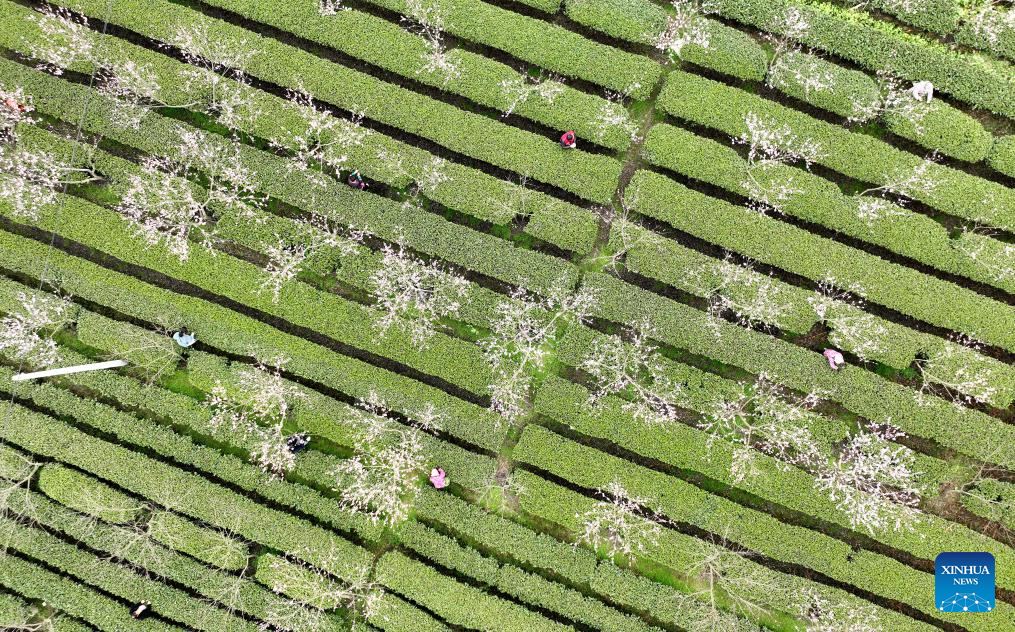 An aerial drone photo taken on March 20, 2024 shows farmers picking tea leaves in Zhaitang Village, Sanjiang Dong Autonomous County, south China's Guangxi Zhuang Autonomous Region. (Photo by Wu Lianxun/Xinhua)