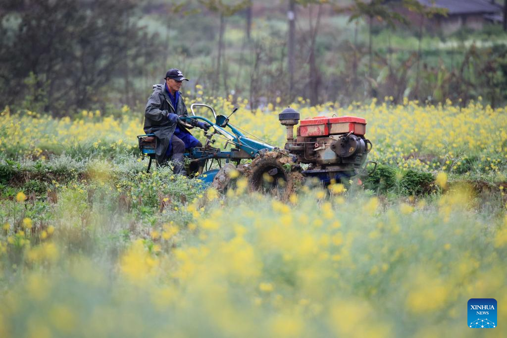 A farmer drives a tractor to plough the field in Sanmu Village, Liuzhou City of south China's Guangxi Zhuang Autonomous Region, March 18, 2024. (Photo by Tan Kaixing/Xinhua)