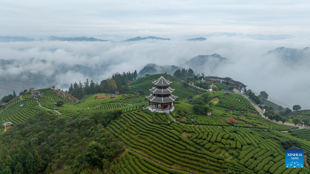 An aerial drone photo taken on March 14, 2024 shows a tea garden in Sanjiang Dong Autonomous Region, Liuzhou City of south China's Guangxi Zhuang Autonomous Region. (Photo by Li Hanchi/Xinhua)