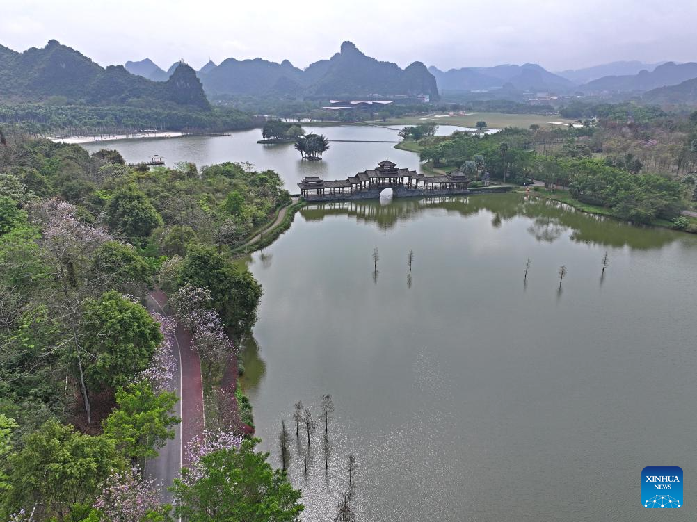 An aerial drone photo taken on March 23, 2024 shows spring scenery at a scenic spot in Nanning City of south China's Guangxi Zhuang Autonomous Region. (Xinhua/Zhou Hua)