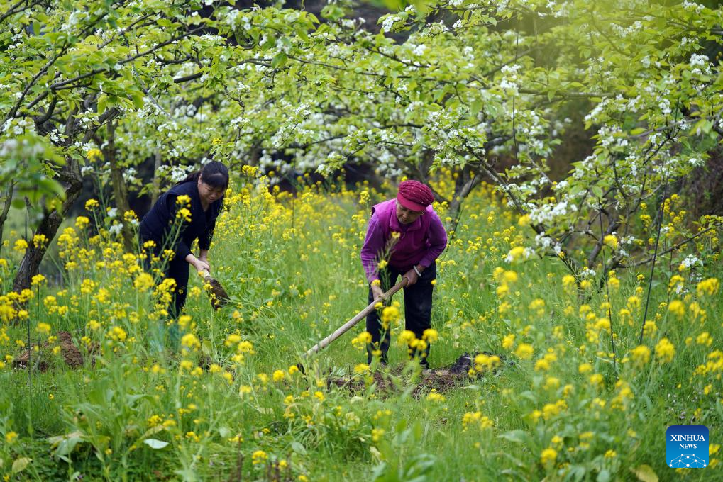 Villagers work in a pear orchard in Menghua Village, Longsheng County of Guilin City, south China's Guangxi Zhuang Autonomous Region, March 21, 2024. (Photo by Wei Jiyang/Xinhua)