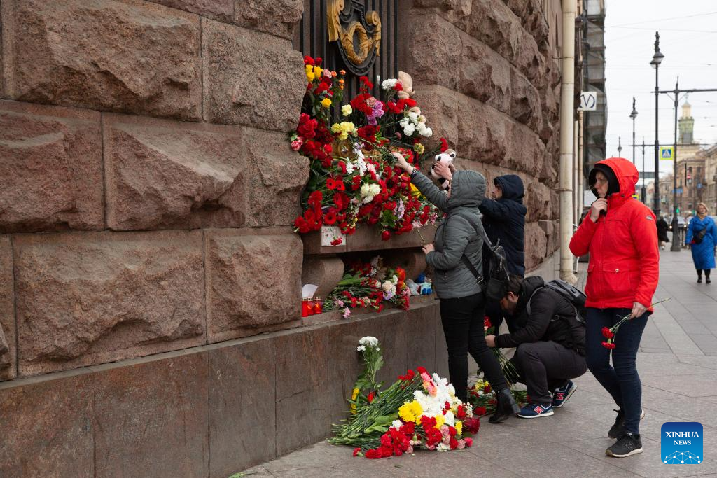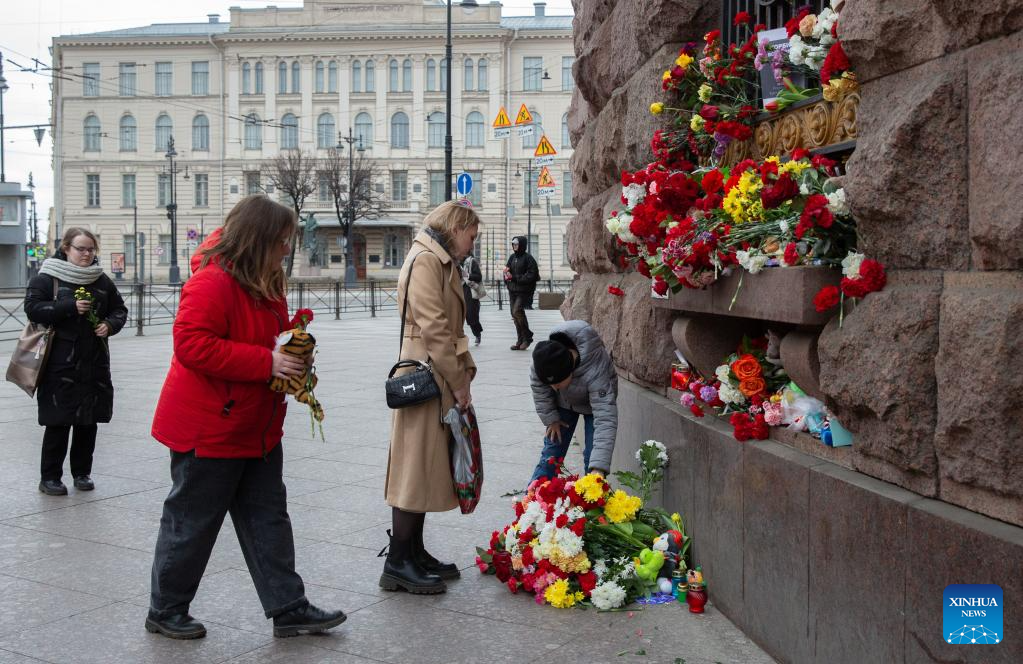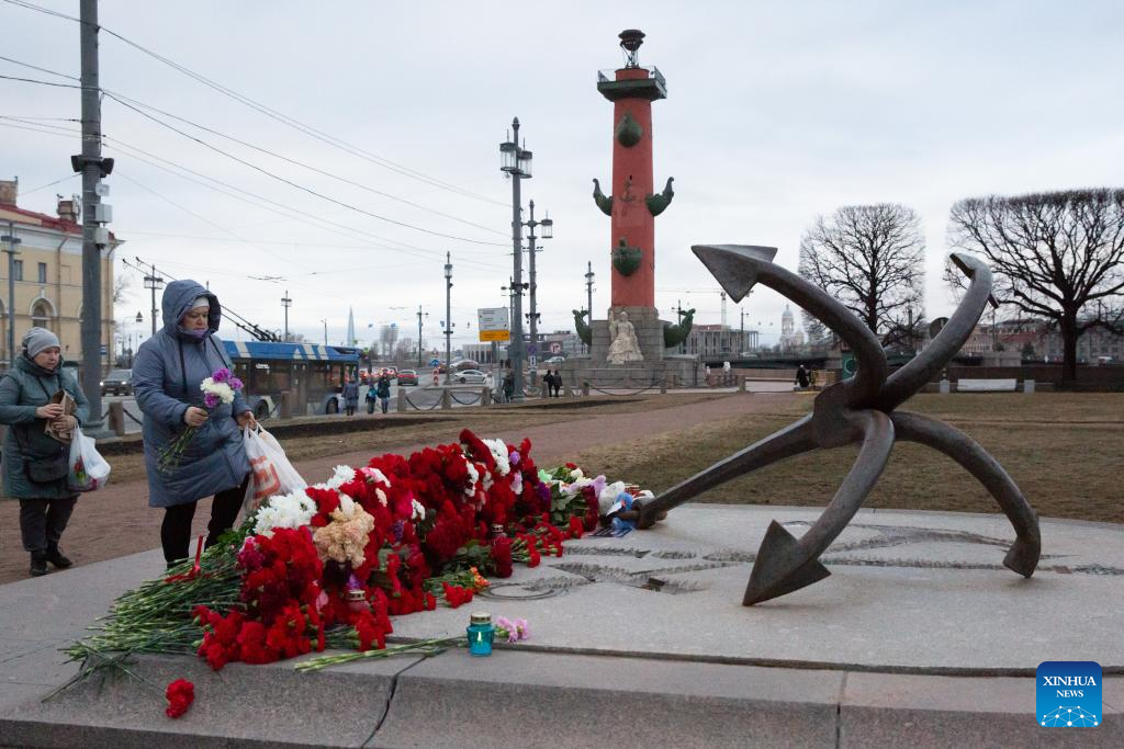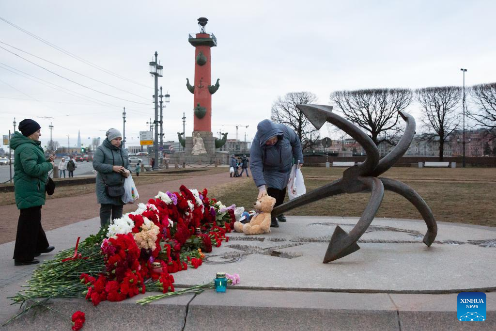 People lay flowers to commemorate victims of Moscow terrorist attack in St. Petersburg, Russia, March 23, 2024. (Photo by Irina Motina/Xinhua)
