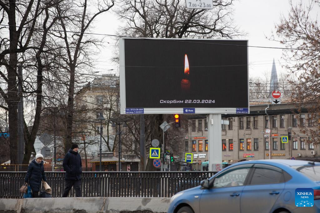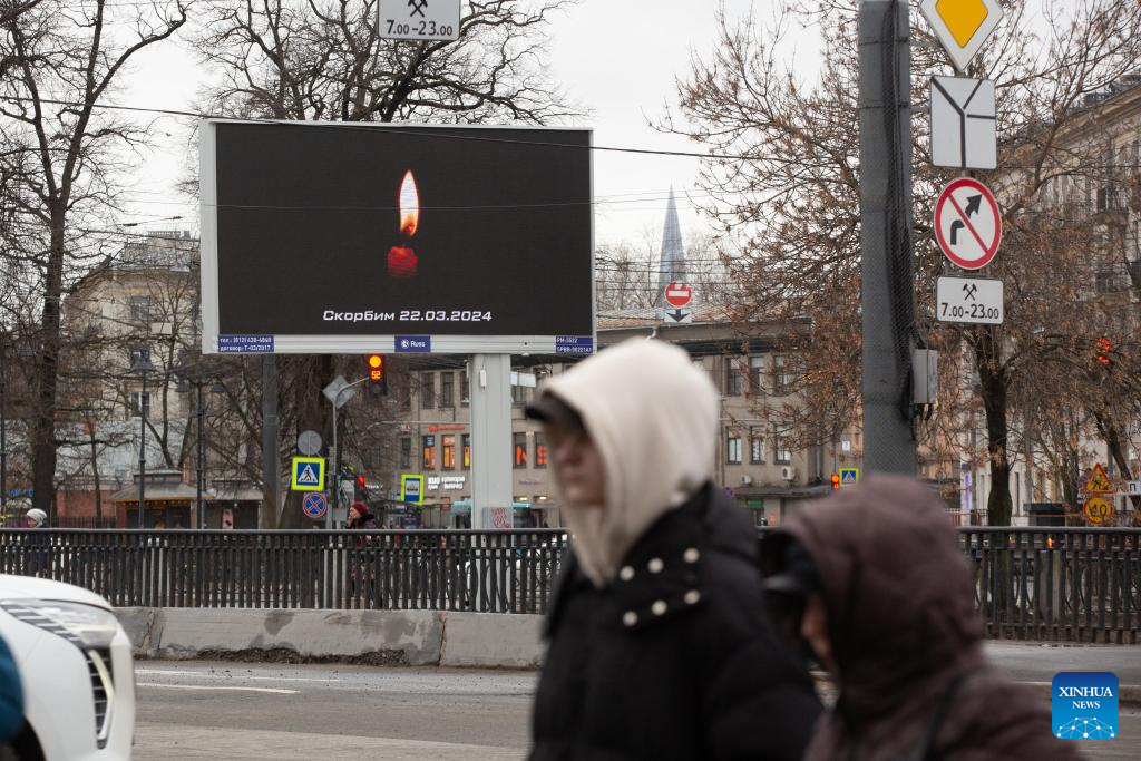 An electronic screen shows an image mourning for victims of Moscow terrorist attack in St. Petersburg, Russia, March 23, 2024. (Photo by Irina Motina/Xinhua)