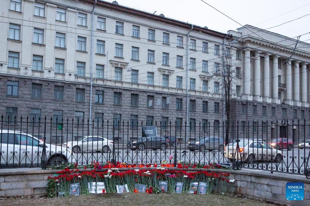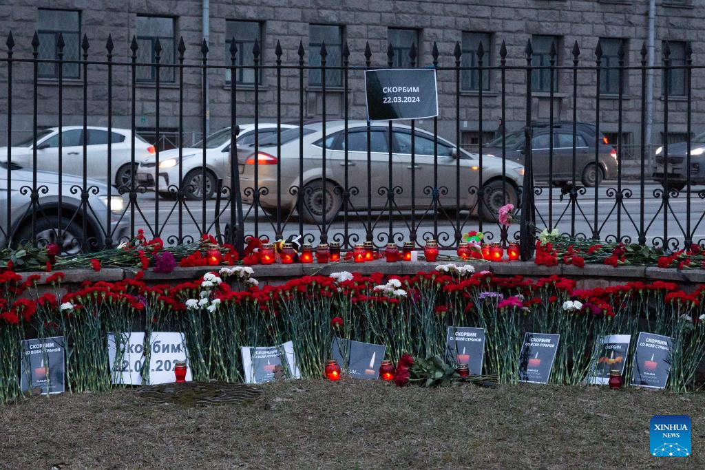 People mourn for victims of Moscow terrorist attack in St. Petersburg, Russia, March 23, 2024. (Photo by Irina Motina/Xinhua)