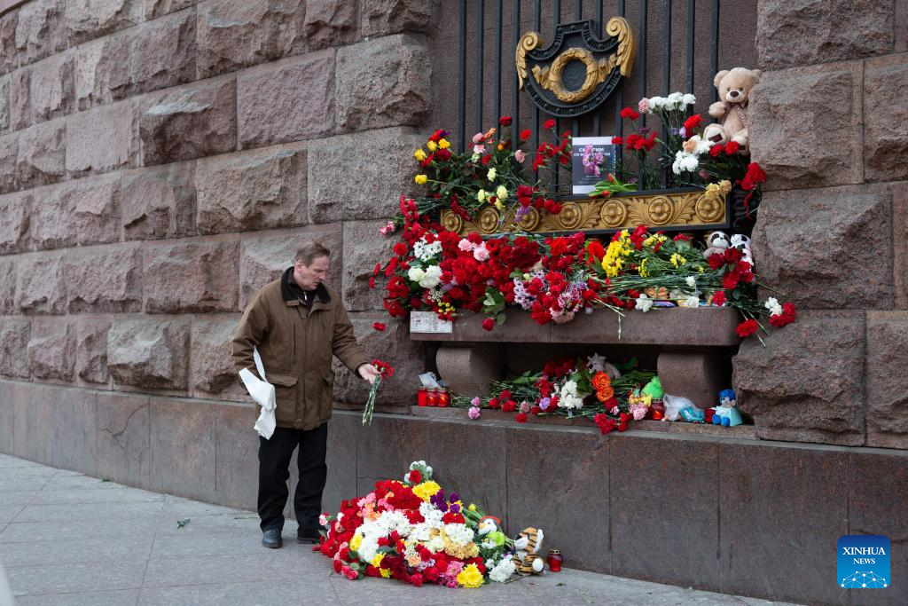 A man lays flowers to commemorate victims of Moscow terrorist attack in St. Petersburg, Russia, March 23, 2024. (Photo by Irina Motina/Xinhua)