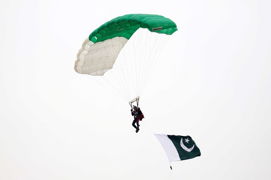 A Pakistan air force paratrooper performs during the Pakistan Day military parade in Islamabad, capital of Pakistan on March 23, 2024. (Xinhua/Ahmad Kamal)