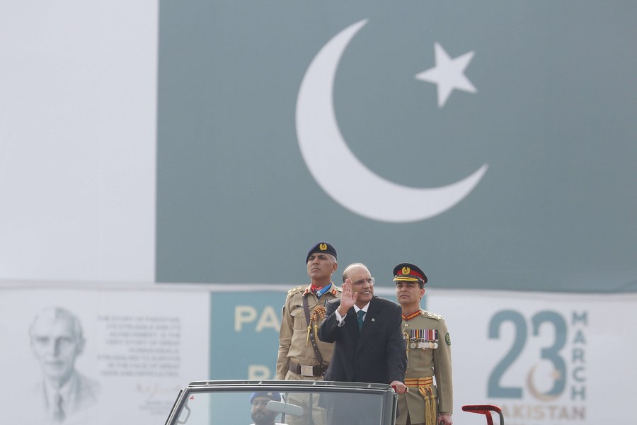 Pakistani President Asif Ali Zardari waves as he inspects the Pakistan Day military parade in Islamabad, capital of Pakistan on March 23, 2024. (Xinhua/Ahmad Kamal)