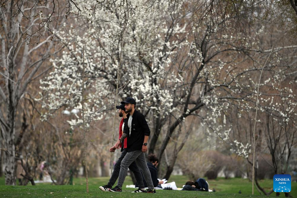 People enjoy spring time at a park in Tehran, Iran, March 24, 2024. (Xinhua/Shadati)