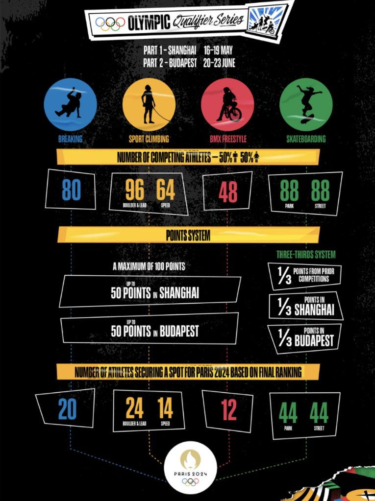 As the ultimate qualification event to Paris for breaking, sport climbing, BMX freestyle and skateboarding, an equal number of male and female athletes, including 80 break-dancers, 96 boulder & lead climbers and 64 speed climbers, 48 BMX cyclists, 88 park and 88 street skateboarders, will compete in the Olympic Qualifier Series in Shanghai on May 16-19 and Budapest on June 20-23, respectively.