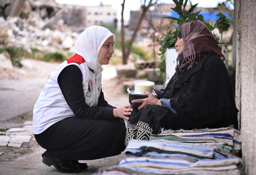 A volunteer from the team "Youth Impression of Syria" distributes a free meal to a woman on the outskirts of Damascus, Syria, on March 22, 2024. (Photo by Ammar Safarjalani/Xinhua)