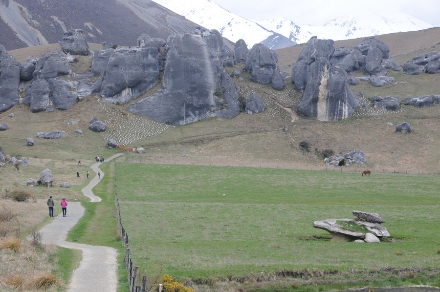 Photo taken on Oct. 11, 2021 shows a view of huge boulders and rock outcrops of Castle Hill in New Zealand's Southern Alps. (Xinhua/Lu Huaiqian)
