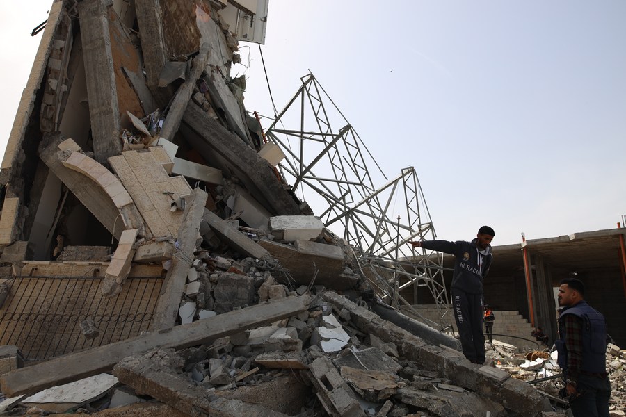 People are seen among the rubble of a destroyed building after Israeli strikes in the town of al-Zawaida in central Gaza Strip, on March 27, 2024. (Xinhua)