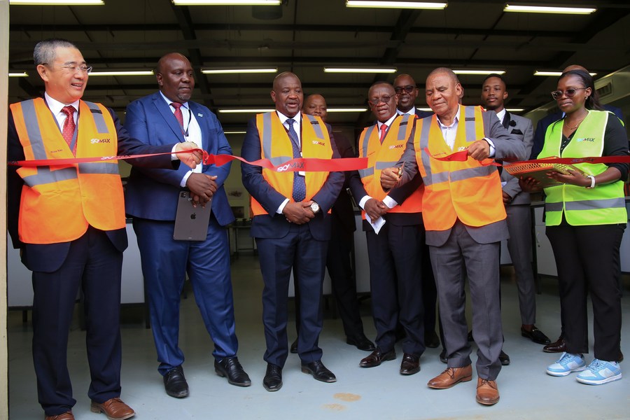 Slumber Tsogwane (2nd R, front), the acting president of Botswana, cuts the ribbon to officially open a drone assembly and testing center in Palapye, about 272 kilometers northeast of Gaborone, Botswana, on March 27, 2024. (Photo by Metlha Ngubevana/Xinhua)