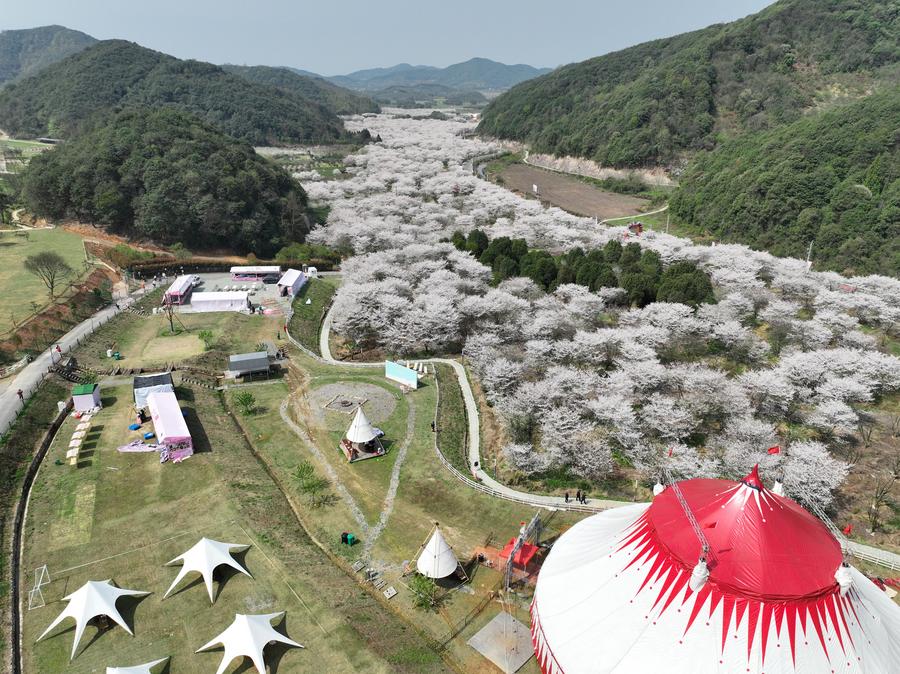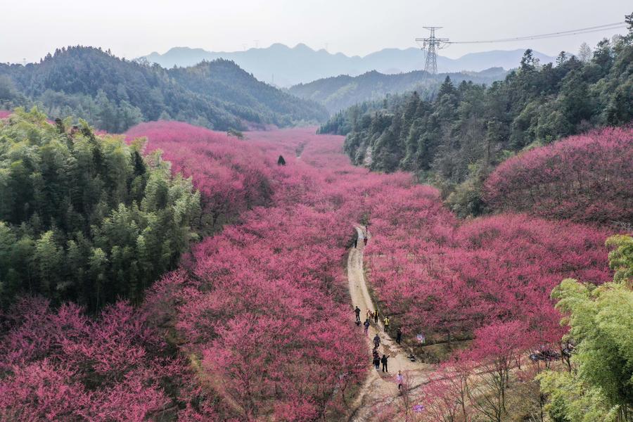 An aerial drone photo taken on March 2, 2024 shows tourists walking amid cherry blossoms in Miji Village of Lin'an District in Hangzhou, east China's Zhejiang Province. (Xinhua/Xu Yu)