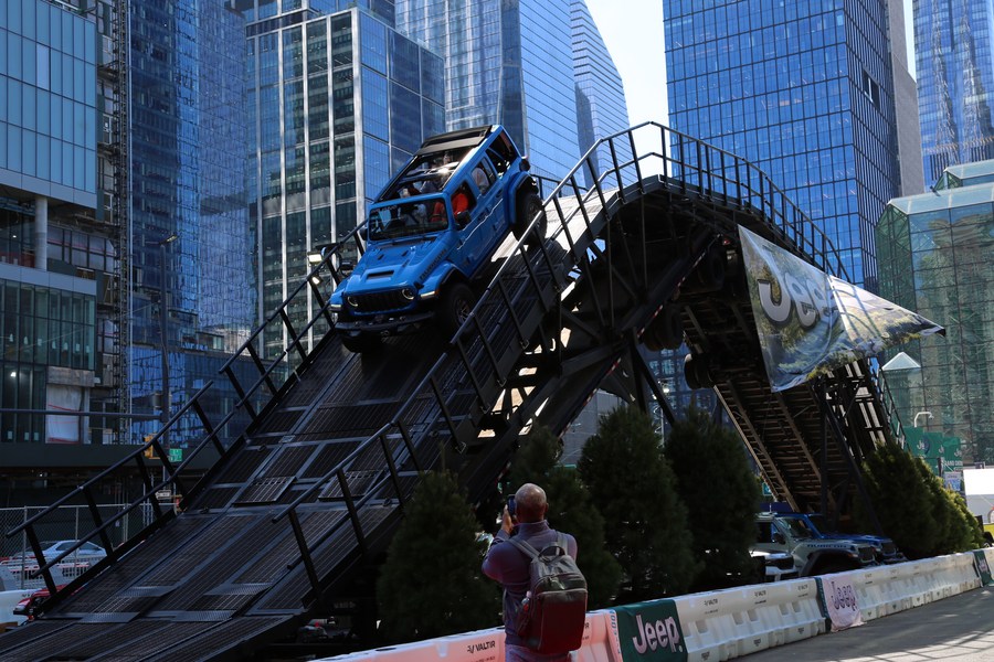 A visitor looks at a vehicle on a test track at the New York International Auto Show 2024 in New York, the United States, on March 29, 2024. (Xinhua/Liu Yanan)