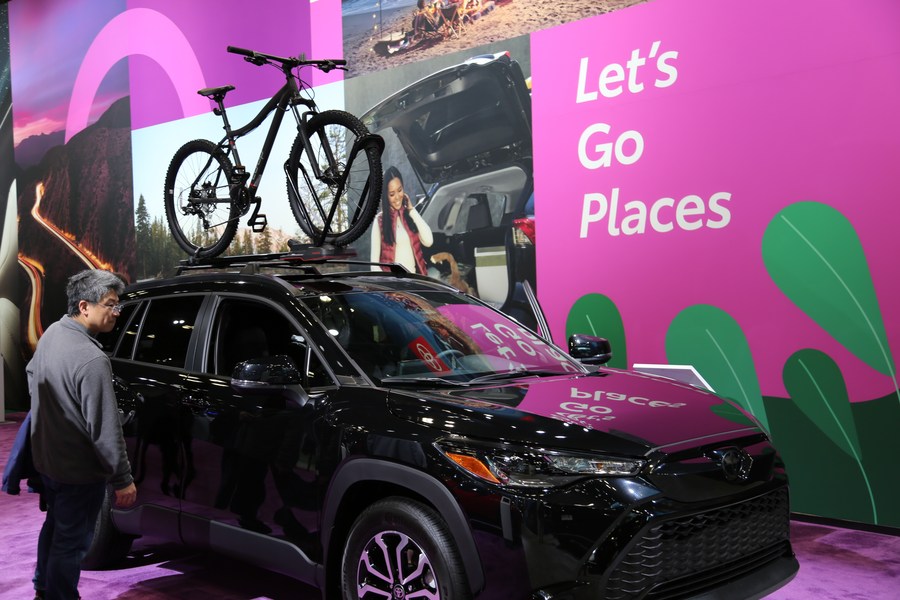 A visitor looks at a vehicle at the New York International Auto Show 2024 in New York, the United States, on March 29, 2024.(Xinhua/Liu Yanan)